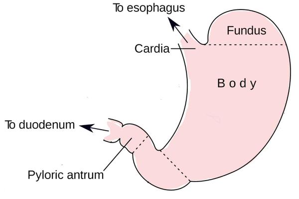 The top part of your stomach is called the "cardia" which contains muscles that prevent food from going back up towards your mouth. The main part of your stomach is called the "corpus", and it is where the stomach begins to process the food.