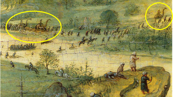 before dinosaurs were even known in our modern world! Long before it was "decided" that dinosaurs died out 65 million years ago! What are they doing pictured in a scene painted in 1562?!!