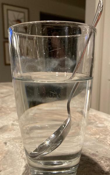 The spoon in this image seems to stop at the water's edge, then reappear in a different place under the water!