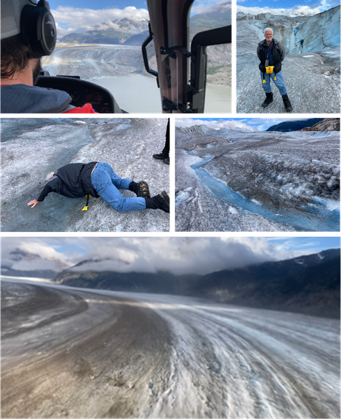 Only one guess from last week was correct -- they were two pictures taken on Stuart Glacier. I had the privilege to fly in a helicopter to the top of it, and immediately beneath my feet under a thin "crust", the glacial ice is deep blue! I was