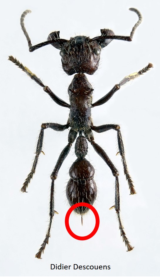However to the south, in the tropical rainforests of Central and South America, is a creature with an even more painful sting. This is the bullet ant -- a large black ant that can reach up to 1.2 inches in length. Notice the long stinger at the