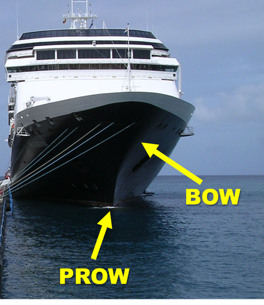 Now, consider the forward parts of a ship that are above the water line. The front of the ship is called the bow and the "sharp" part of the bow is called the prow. The prow is also specifically designed to allow more efficient forward movement of the ship in