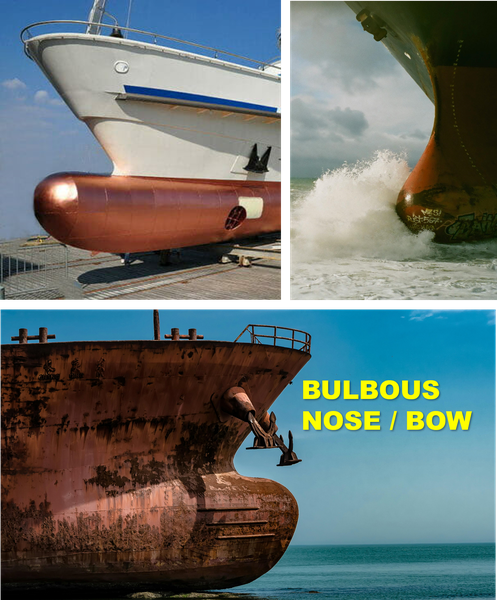 We receive repeated questions regarding the shape and design of Noah's Ark, specifically the outside. Let's start by considering the front of many ships, like tankers, freighters, and cruise ships. Many of them have what's called a "bulbous nose", or bow. This is essentially an extension of the ship at the front, but just at or under the water line when the ship is loaded. The sole purpose of the bulbous bow is to provide efficiency to the engines. There is no other purpose for this design. It's actually quite unique in that it reduces friction, and can actually save a