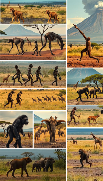 I was trying to create a scene similar to one that was originally painted to depict Australopithecus apemen walking in wet, volcanic ash, with African animals in the background. I had to reject most of the images - by far! Hundreds of them. Look how funny these are! This top one looks like a cross between a lion and an apeman! Then, what in the world are